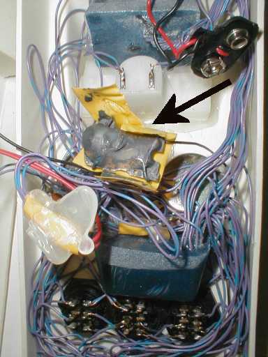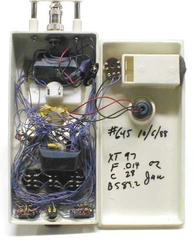 The inside of the 301 is shown in Figure 3. It is very similar in apperarance to the Model 20, containing the same two epoxy modules that appear to have been molded in an ice cube tray, and the excessive amounts of "Bell"-type wire, again all one color. Besides the additional controls, there is one small module not contained in the Model 20, shown in Figure 4. Also note the marker notations on the inside of the upper case. Most likely, this is meaningless gibberish. |