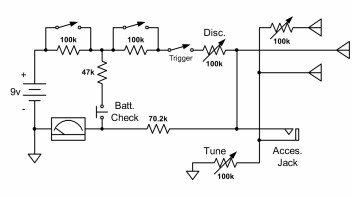 The two circuit paths for the gold and silver modes are identical except for the mystery module, which does not do anything, so I've reduced the two paths down to one. It is easier to see that the circuit applies a variable DC voltage across the antennae; that two of the switches switch in extra 100k resistors to reduce the voltage range; and that the potentiometer on the upper antenna is part of an open circuit, and has no effect whatsoever. Also note that the "Tune" potentiometer does nothing at all because it is also part of an open circuit, unless a "module" is plugged into the "accessory jack". From the Model 20 report, we saw that one such module is nothing but a 1k resistor connected across the plug. Two more similar modules that came with this unit also measured to have a resistance of 1k across the plug, so all they are designed to do, is drain the battery. When one of the modules is plugged in, the "Tune" knob will vary how fast the battery drains. So, the end result, is that the Model 301 is functionally identical to the Model 20. |